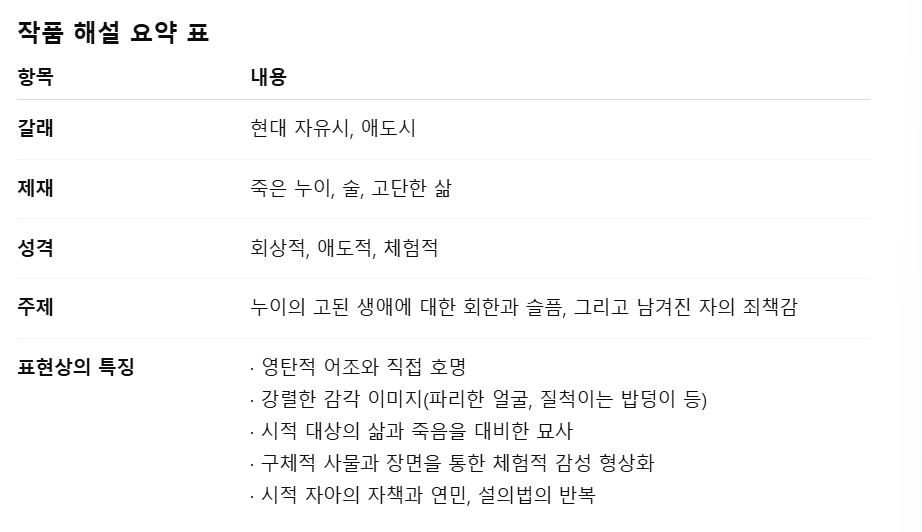 이 시는 고대 향가인 제망매가와 연결되며, 죽음과 이별, 남겨진 자의 슬픔을 현대적인 언어로 그려냅니다.