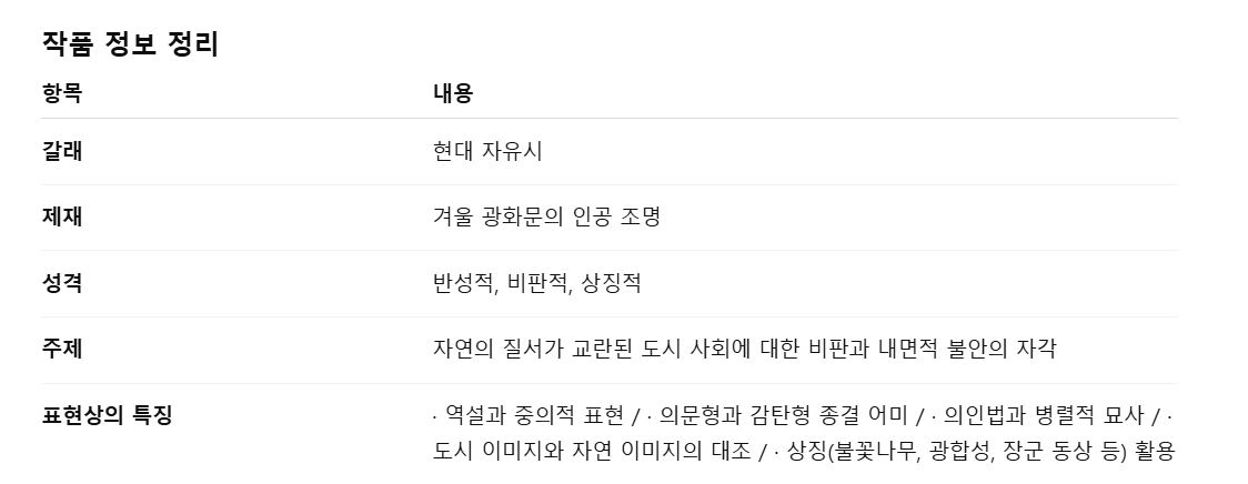 이문재 시인의 「광화문 겨울 불꽃 나무」는 서울이라는 도시 공간 속에서 발견되는 생명과 상징의 흔적을 시적으로 그려낸 작품입니다.