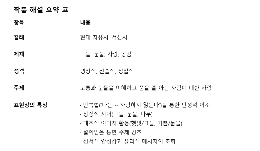 「내가 사랑하는 사람」은 시인이 추구하는 실천적 사랑의 메시지가 가장 잘 드러나는 대표작 중 하나입니다.