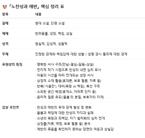 김애란의 단편소설 「노찬성과 에반」은 청소년기의 성장, 책임감, 그리고 상실을 다룬 작품입니다.