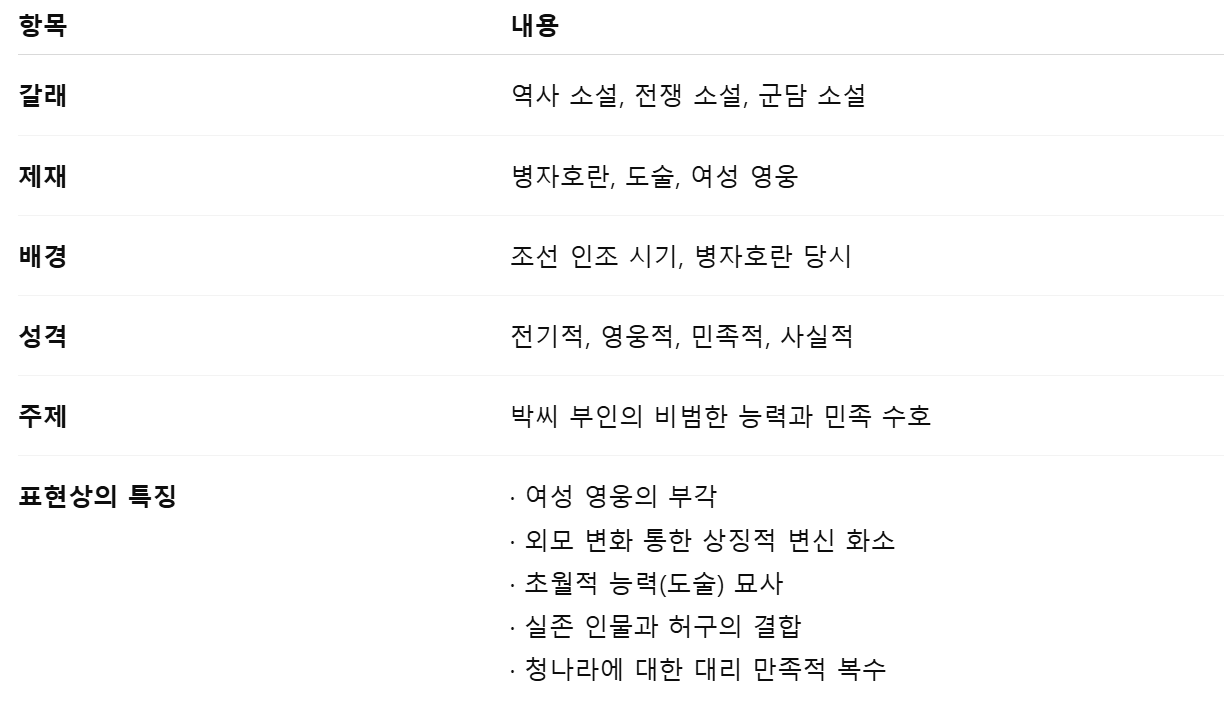 | 갈래 | 역사 소설, 전쟁 소설, 군담 소설 |