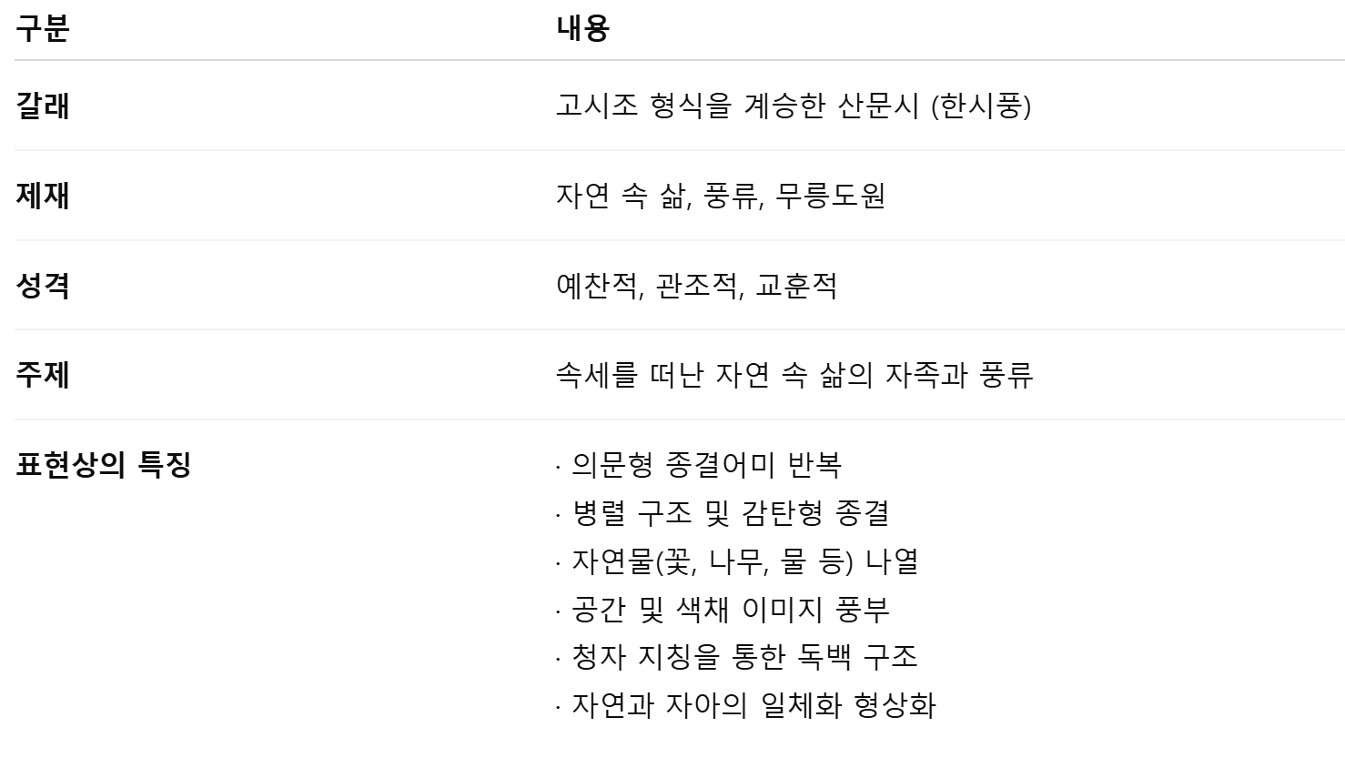 • 성격: 서정적, 묘사적, 예찬적