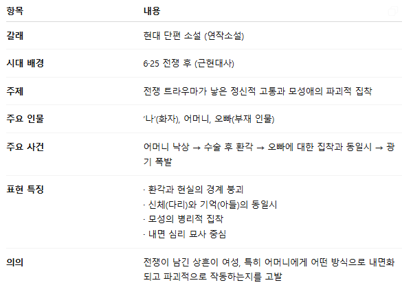 - 화자는 무너지는 어머니를 지켜보며 전쟁의 상처가 여전히 현재에 살아 있음을 깨달음