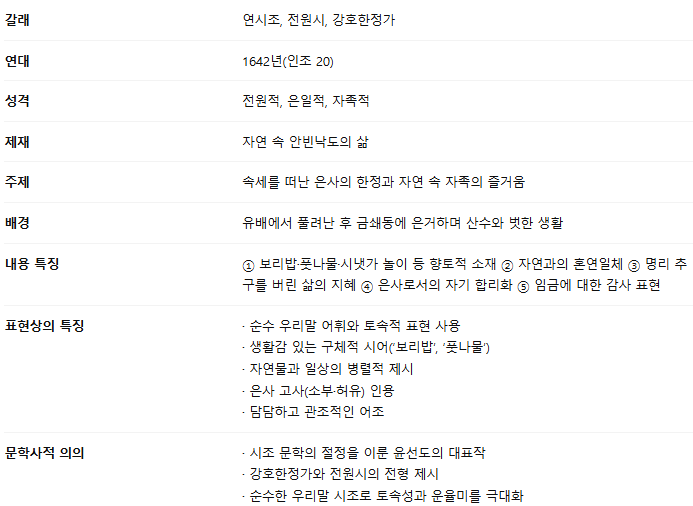 - 주제: 자연 속 안빈낙도의 삶과 은사(隱士)의 한정(閑情)