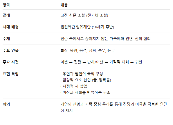이 소설은 전란으로 인한 가족의 이산과 극적인 재회를 중심으로 전개됩니다.